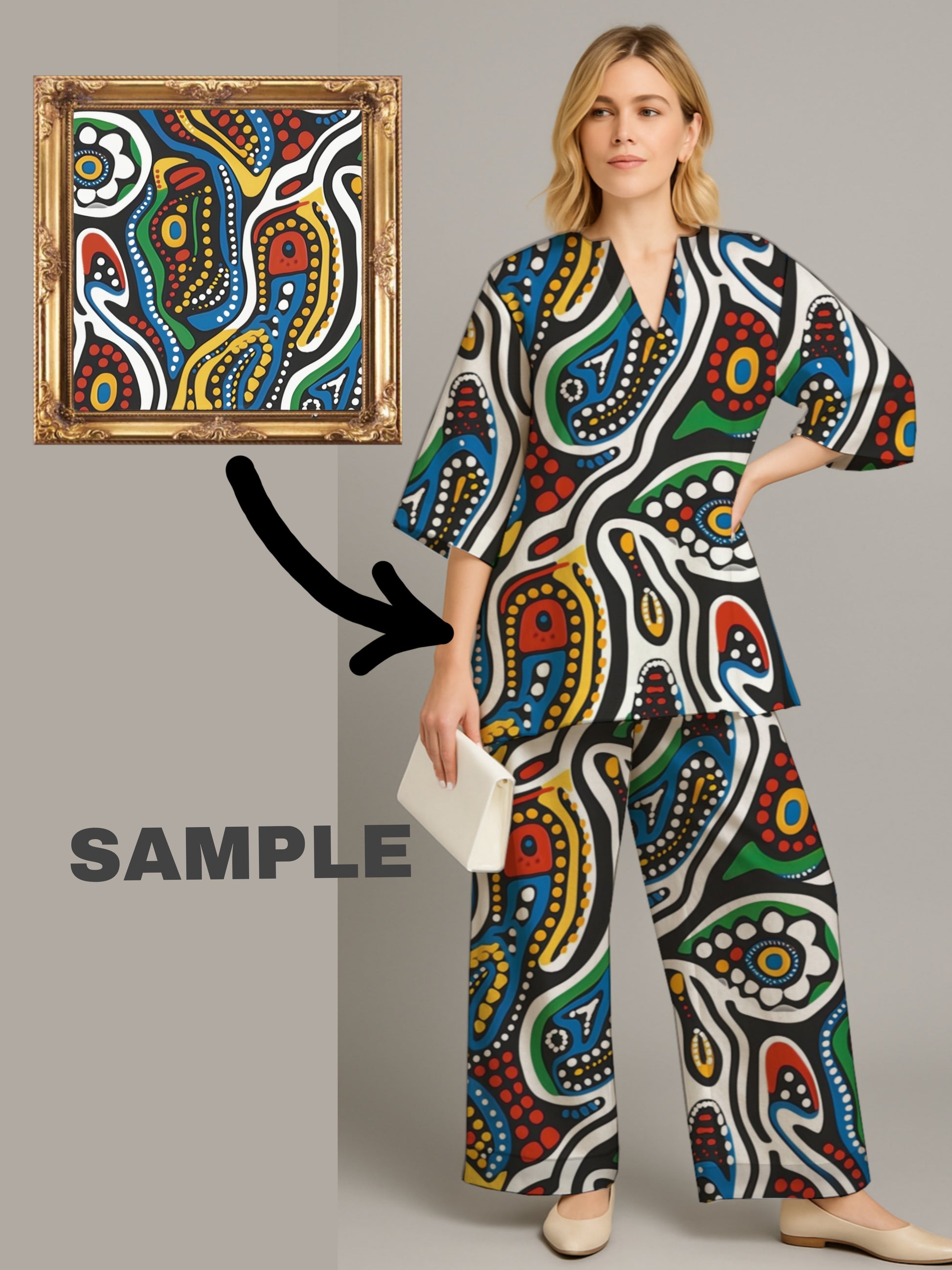 - A custom two-piece set (tunic top + wide-leg pants) printed with your original art