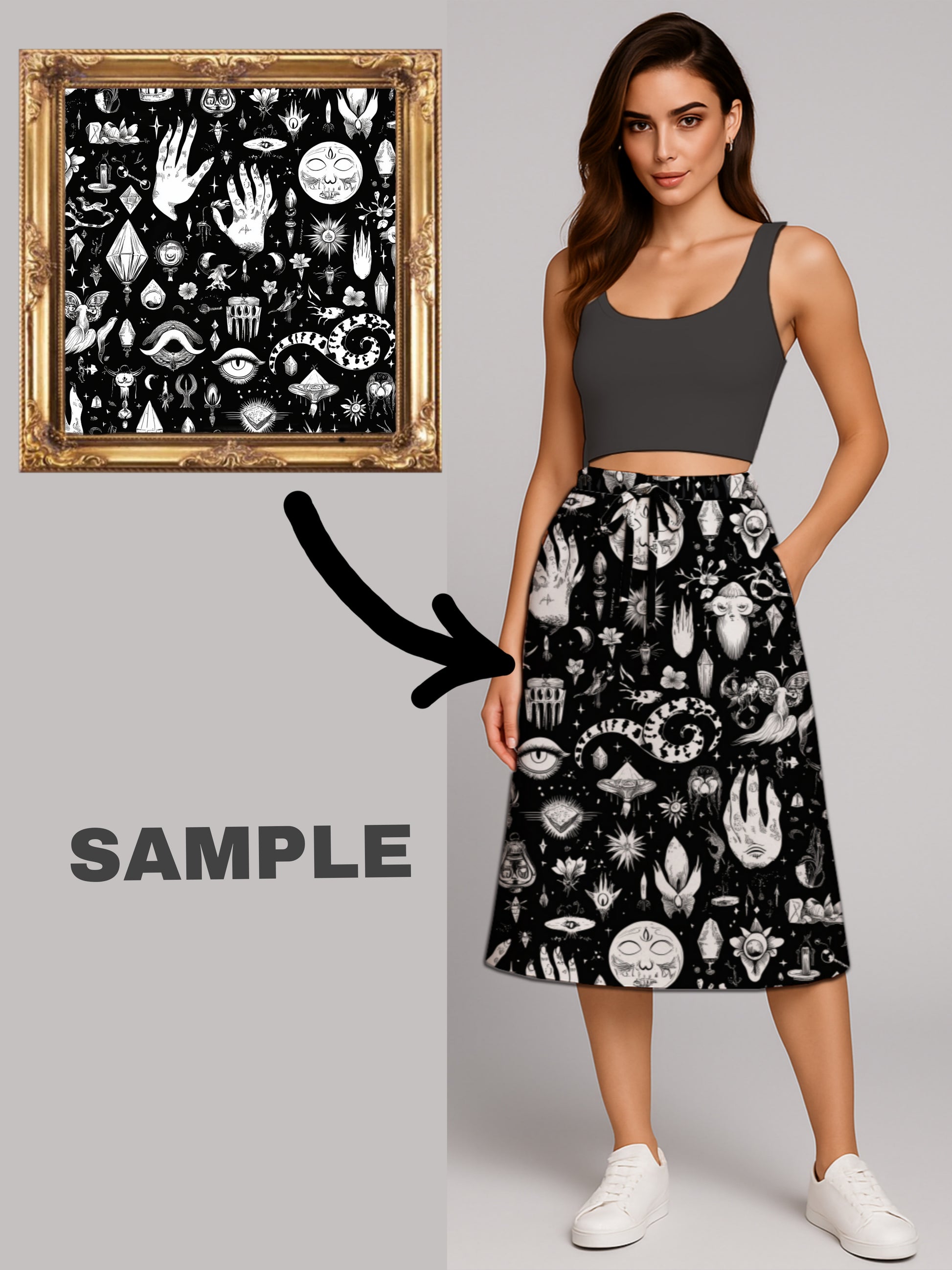 Your art is printed on soft, sustainable fabric and stitched into a flattering A-line skirt — ready to wear in the size you choose.