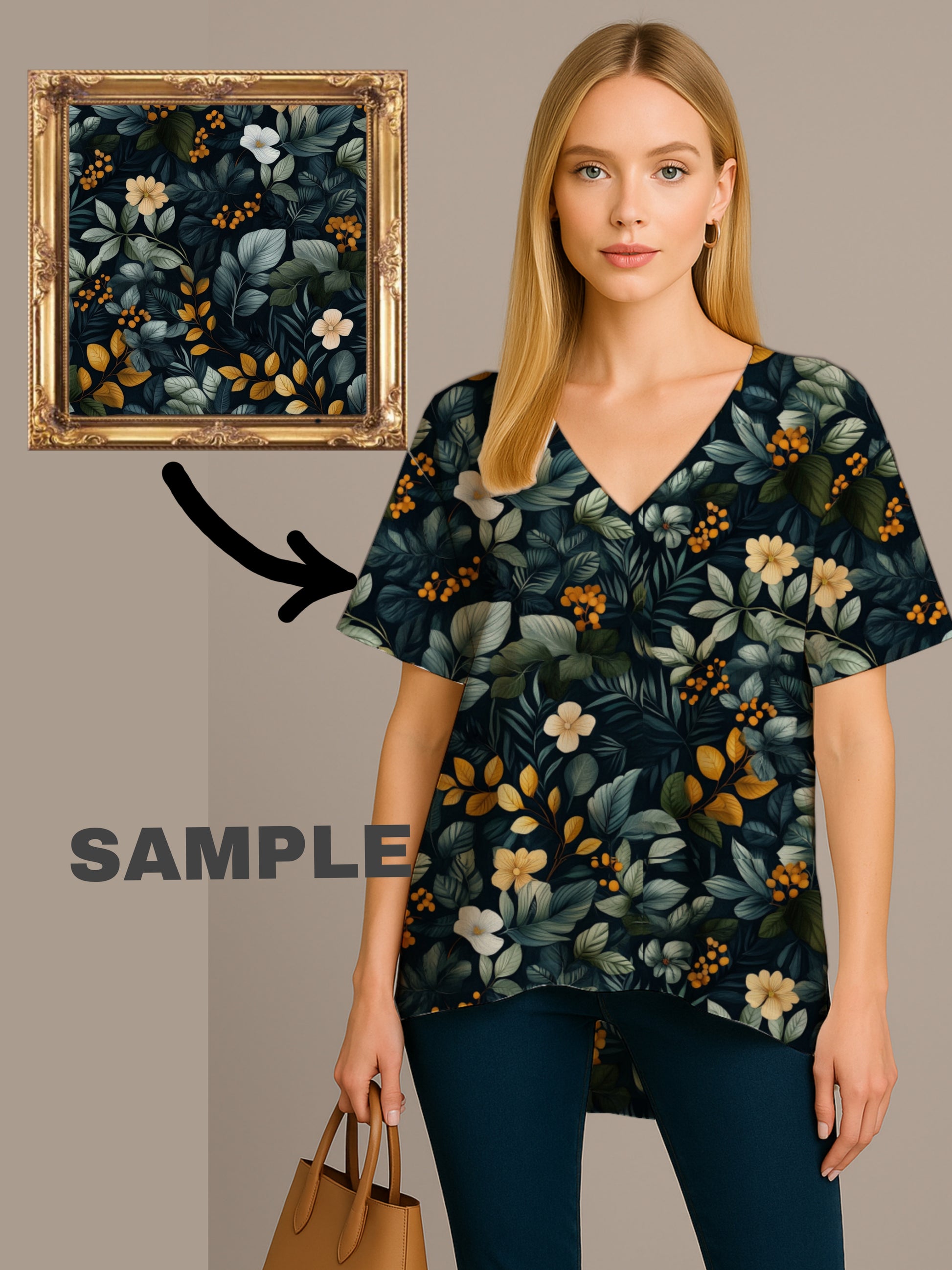 - A custom relaxed-fit V-neck short-sleeve top printed with your original art